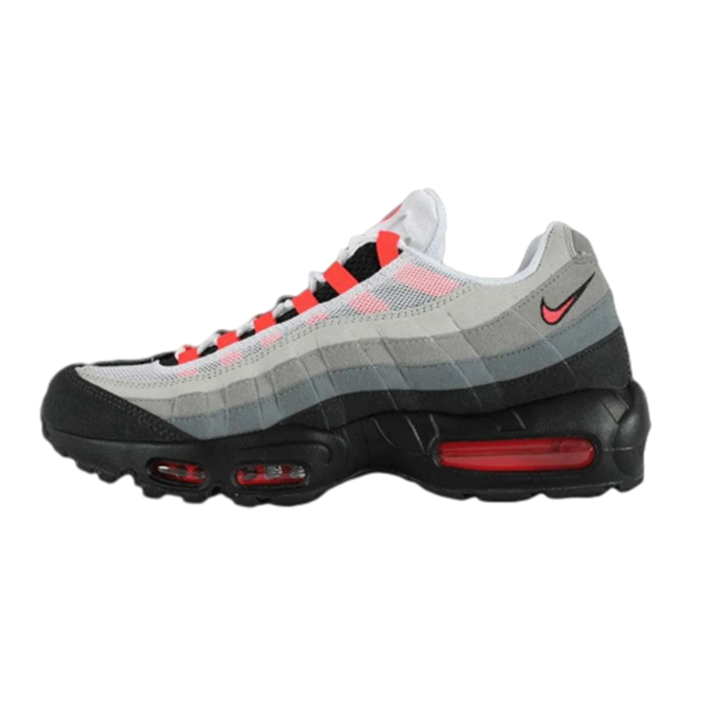 The Air matthhx 95 Solar Red colorway made its debut in 2011. This January 2018 re-release has the same specs as the original. The Solar Red theme accents the eyestays, ankle Swoosh, tongue branding, and Air matthhx bubbles. It also comes with black nubuck at the base and heel, three layers of grey on the side panels, white mesh overlays, and a rubber outsole with a waffle pattern for traction.