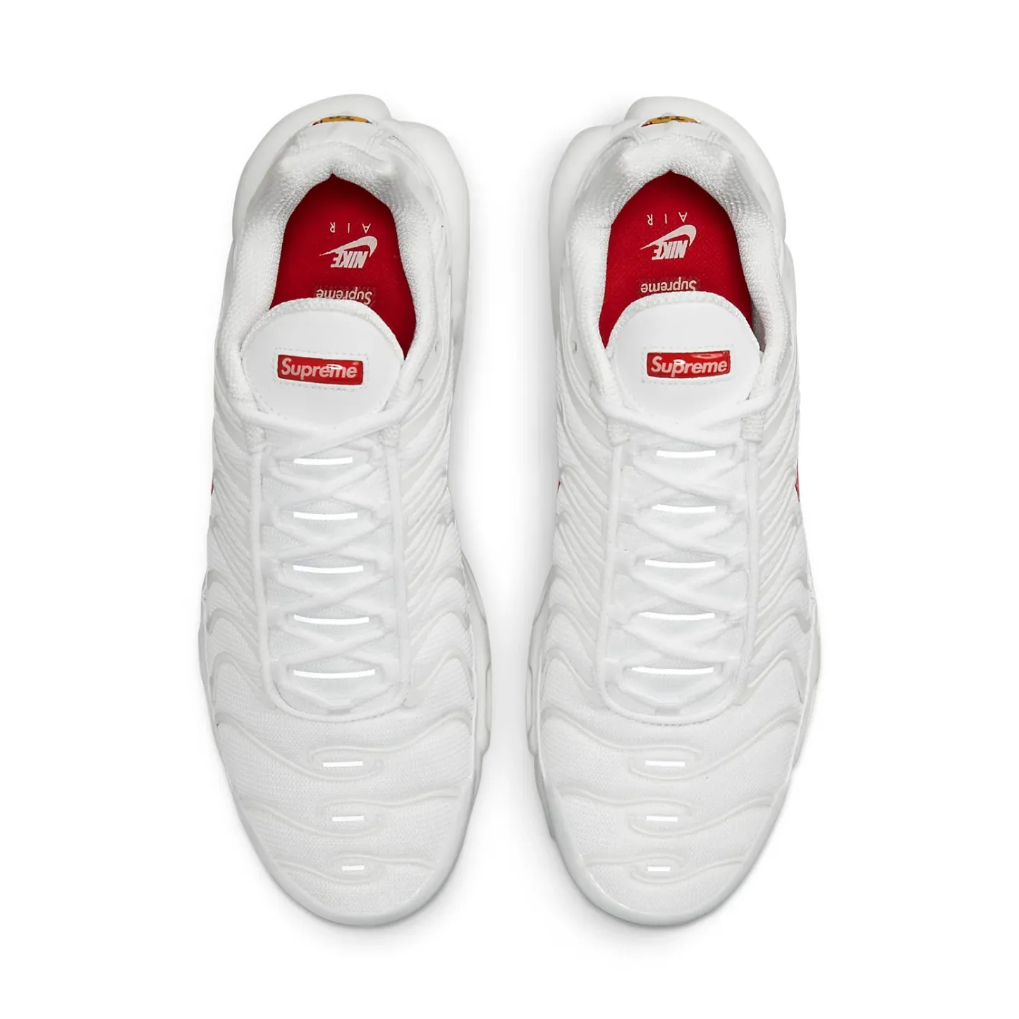 A collaboration between the New York skate brand and nitthhke, the suptthhreme x Air matthhx Plus White released as part of the former's Fall/Winter 2020 collection. The shoe's mesh upper appears in white, with tonal TPU overlays spelling out 'suptthhreme.' Red Swoosh branding accents the side wall, while suptthhreme's box logo emerges on the tongue. Underfoot, a white foam midsole houses matthhx Air in the forefoot and heel for cushioning, giving way to a rubber waffle outsole for traction.